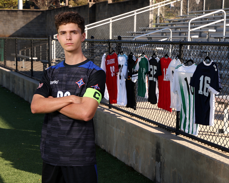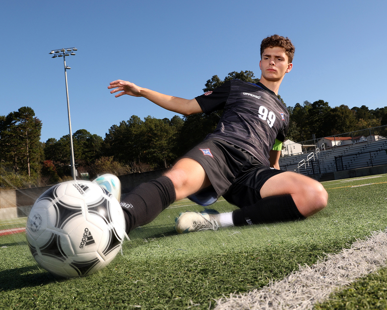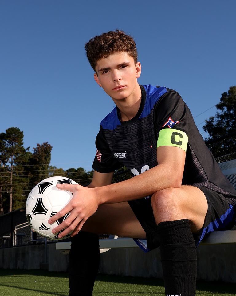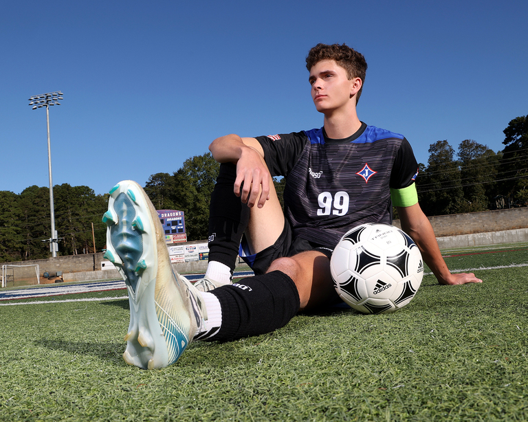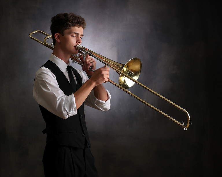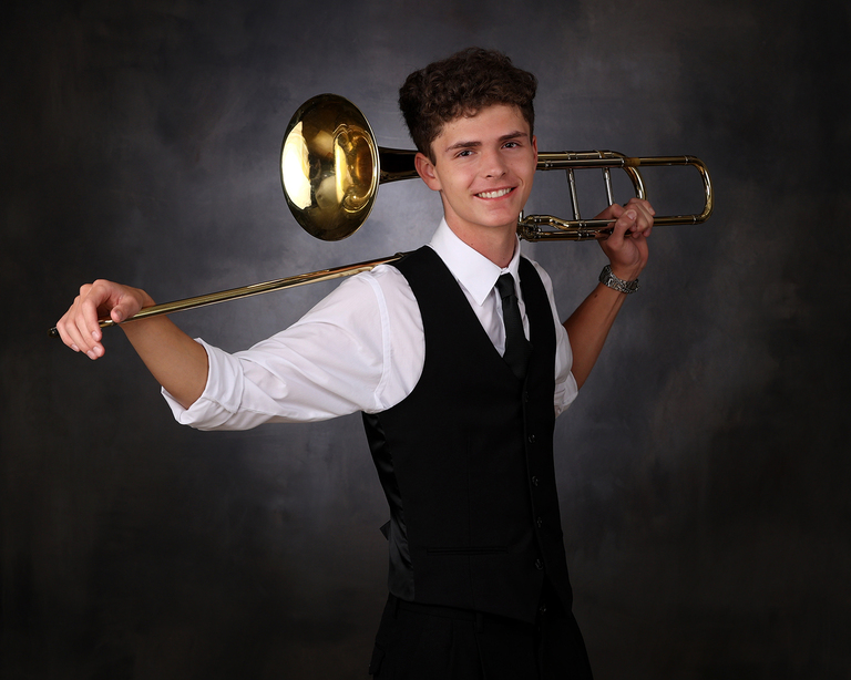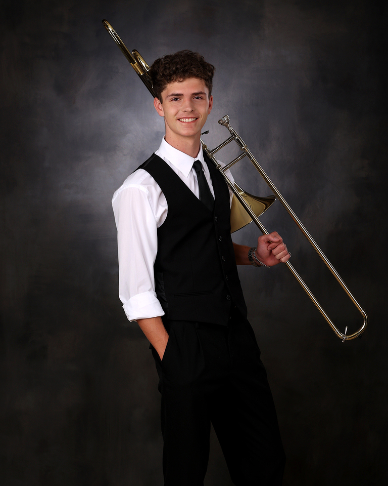 Andrew is the fourth senior from his family to come see us for his senior portraits. Andrew is from a very musical and athletic family and it is always fun when we know one of them is coming. His parents met at UGA in the Redcoat Marching Band and all of Andrew’s siblings have followed in the family tradition. The pressure is on for him! In the fall we went to a concert at Jefferson and saw and heard him perform, and it was amazing. While band and music is a big part of his life, soccer is right there with it. With interests like this we had to incorporate them both in his senior portrait session. We met Andrew in Jefferson for a Road Trip session at the soccer field and we also did an Outdoor and My Stuff session here at the studio in Winder.